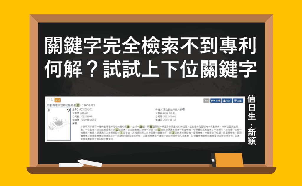 關鍵字完全檢索不到專利何解?試試上下位關鍵字 發佈留言 / 【智財老司機帶我飛】、IN,才施教 / 作者: 新穎公司Innovue 專家們一定聽過的「上下位關鍵字」,放到新手的面前大概會讓人滿滿的問號。為什麼同一件事情會出現「上位關鍵字」跟「下位關鍵字」兩種講法? 不囉嗦,讓我們繼續看下去~