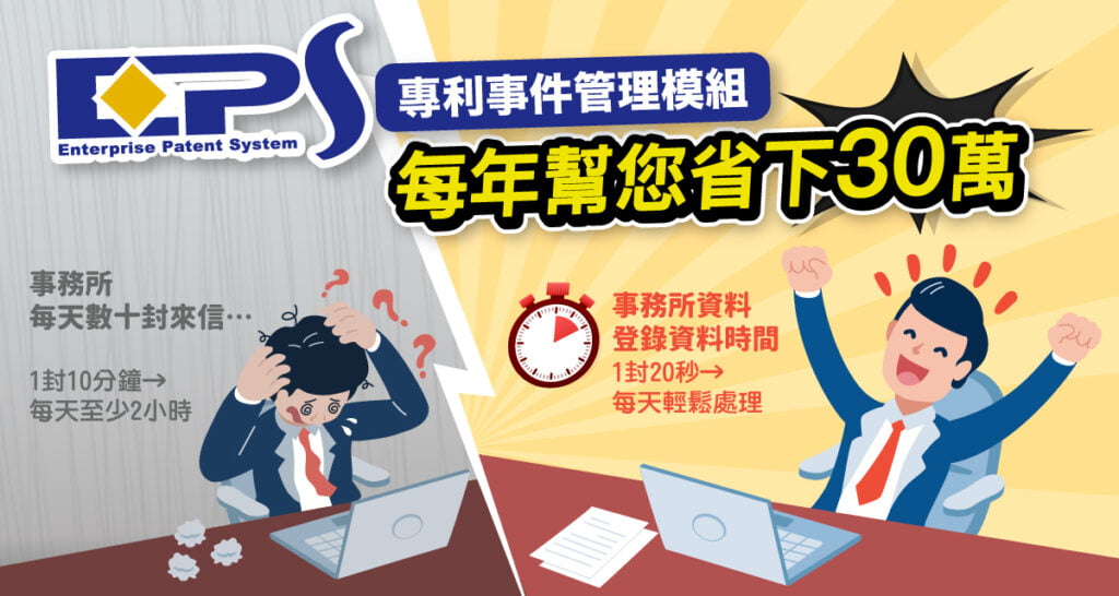 企業專利管理的神隊友-「專利事件管家PSM」誕生囉!讓我們把專利生命週期中的程序事務工作,通通交給事務所就好!但是,別忘記一定要再紀錄回來到我們EPS系統啦!錢是我們付的、資產更是我們的。