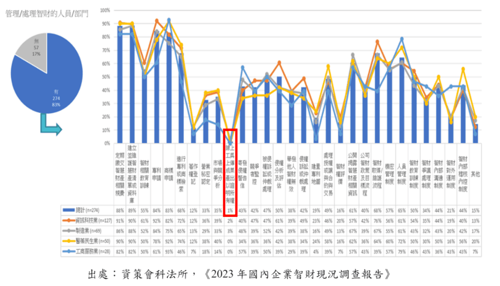 資策會在2023年國內企業智財現況調查報告中,國內只有1%有使用線上工具上傳成果產出以證明所有權(例如區塊鏈),使用普及率很低,我也聽過廠商說:因為大家都覺得目前線上證明的費用太高。