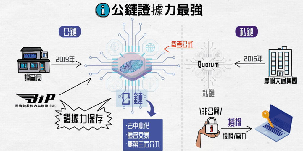 公鏈的證據力一定是毋庸置移的,在新聞媒體的報導上,調查局在2019年也是把鑑定物的數位指紋記載在乙太坊公鏈上。公鏈的特色就是「去中心化」、「匿名交易」,沒有第三方在中間介入。