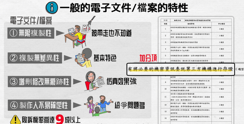 這也會讓企業的發生重要機密外洩時,所造成的不易主張,敗訴高達9成以上,所以在tips AA級的要求中,為了建立「確認具機密性的資訊被有效的管制」,有一項檢視事項就是「有將必要的機密資訊委託第三方機構進行存證」,現在評分類型是屬於加分題,不是必要要求題項,只是加分鼓勵。