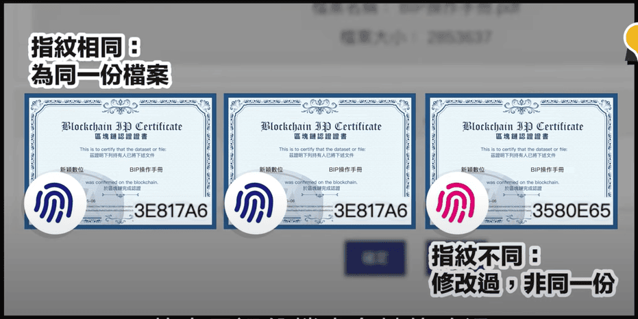 您上傳的檔案,我們只會就檔案的雜湊指紋進行上鏈,也就是我們會將您的檔案蓋個指紋,這個指紋,一般又稱為hash