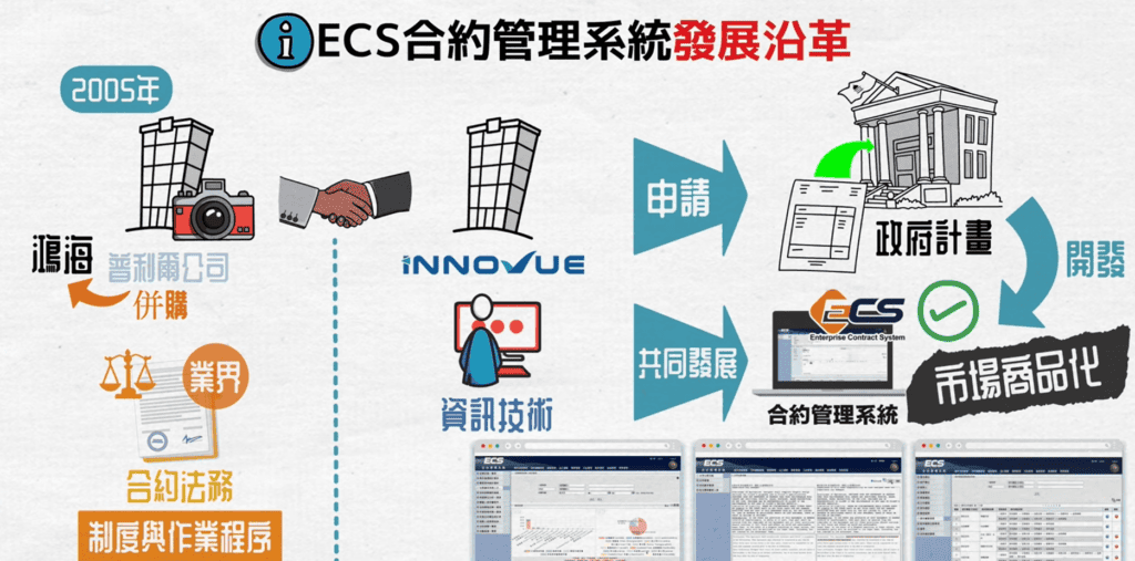 「合約管理系統ECS」目前導入的國內廠商已經超過600多家,市場導入實績非常豐富的。我們是在2006年跟國內有一家「普立爾」,是做數位相機的公司,後來被鴻海併購了。一起申請政府計畫開發完成的,後續我們公司持續進行市場商品化。