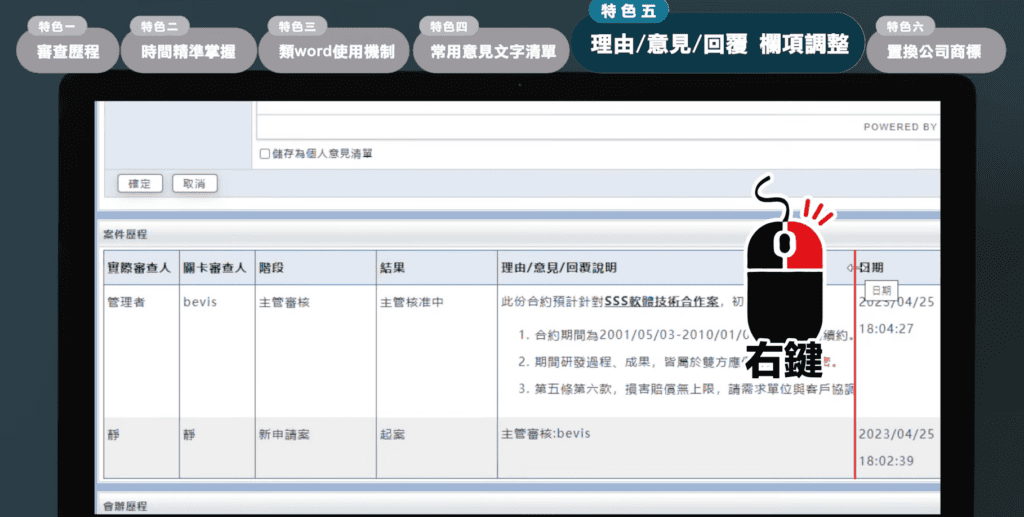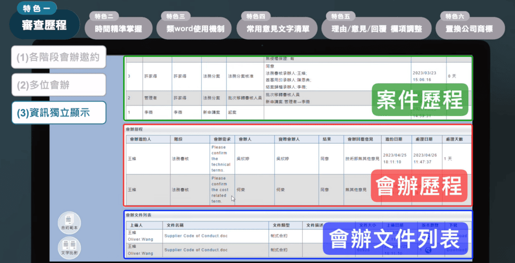 我們系統的特色,就是會將這案件的審查歷程與會辦單位的會辦歷程,包含邀約需求,會辦的意見回復、處理天數等等,分開且忠實地記錄。