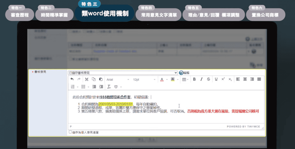 像是功能機制上,如 blockchain的存證紀錄,還有要符合tips的規範,在特定的合約案件類型,我們會加入了合約內容的卡控,如權利歸屬、保密條款的提醒與紀錄。