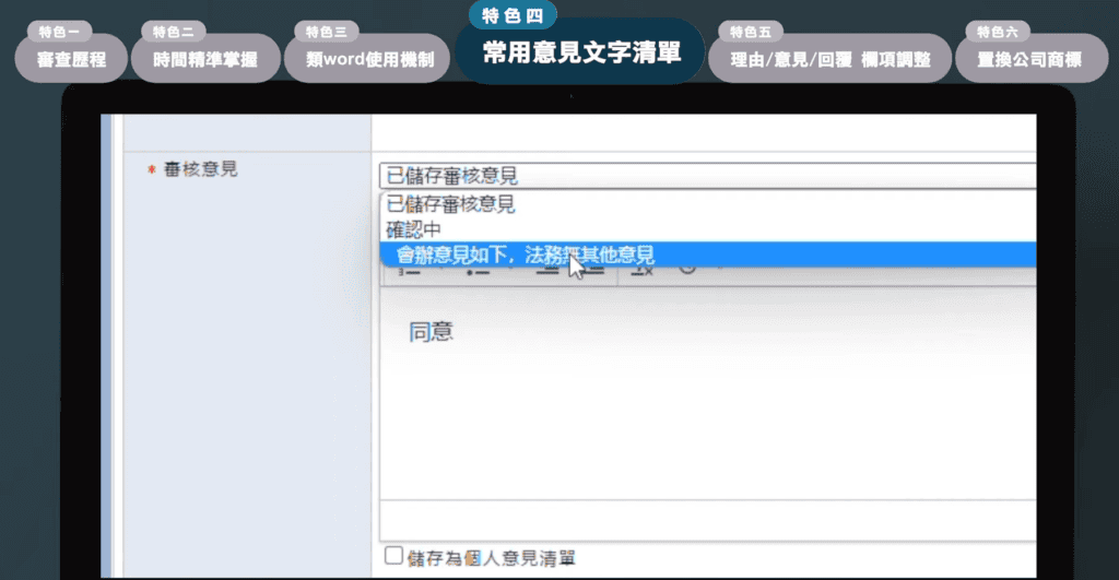 許多審核關卡,通常在通過或是其他情境下,有常用的「意見」表述文字,您可以直接將您這些常用的「意見」表述文字,直接儲存,以後下拉式選單直接拉下,直接點選就好了喔。