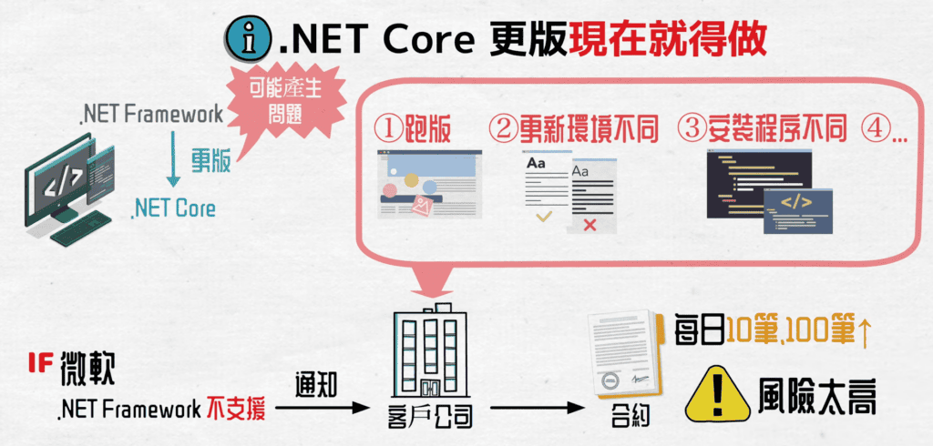 如果等到微軟不支援的時候,我們才開始通知客戶更新問題,我們用戶都是大公司,每天合約案件都有數10件在處理,這風險太高了,合約跟商務營運有關,我們不可以有任何疏失,所以我們一定得要提前2-3年作業。而且這其中,還涉及到更多公司的客製版功能,所以我們先進行標準版公司的更新,後續會開始進行非標準版公司的core版更新。