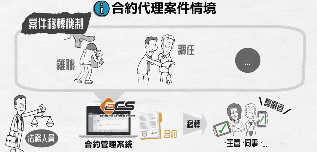 而若是離職同仁或是調任其他單位或是區域等等,這部分我們就直接由合約管理系統進行「案件移轉」,也就是後續這些合約案件的歸屬者都已經轉案到其他同仁身上,這位離職或調任同仁,不再有權限了。