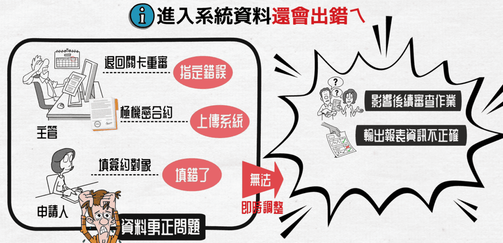 所以企業自行開發的系統,因為資訊人員很忙,不可能隨時協助我們法務針對需要調整的資料進行調整;法務人員也會很害怕,因為確實就在某種情境底下,系統就允許了不該通過的資料,誰都不是故意讓資料出問題的,所以協助處理資料的修復,也會是我們新穎系統服務廠商需要處理的部分。