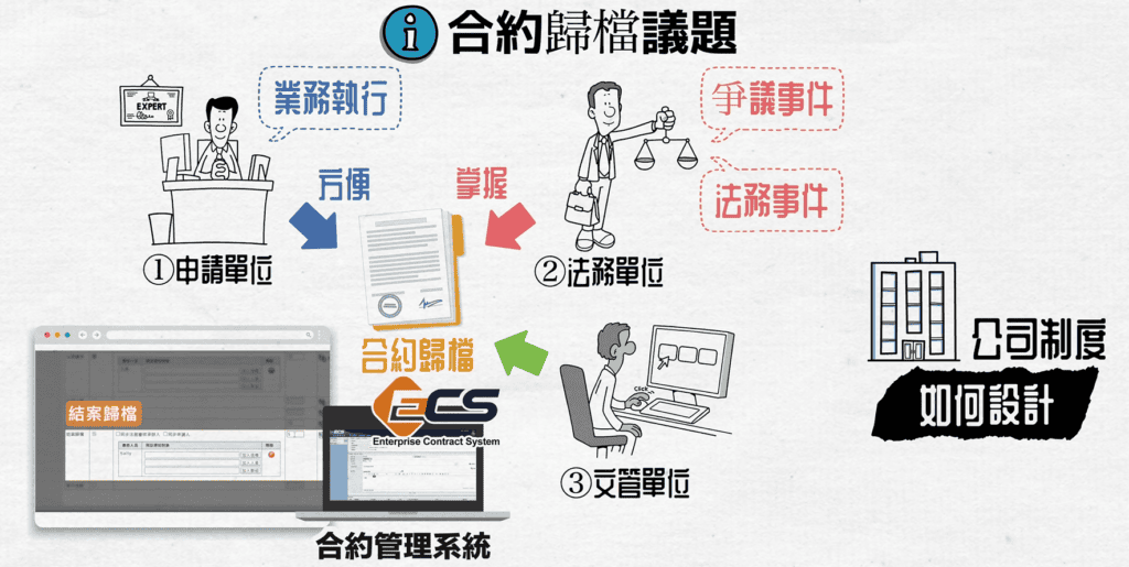 企業您如果對於內部的合約管理制度還不知道要如何規劃,或是想法還在構思,那麼我真的誠心建議您,先導入我們家的ECS,讓企業內部使用以後,會更能理解合約管理的作業情境,以及真實的掌握合約訊息情報,後續再針對不足的功能或機制進行調整,這都是非常好的導入方式,也會最穩健、最容易成功的系統導入作業。