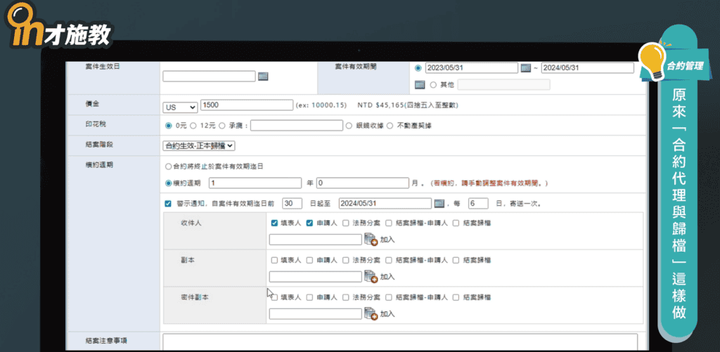 當法務人員請假期間,沒有人審核怎麼辦?肯定都需要代理人協助合約審閱,今天主要跟您討論的是合約代理案件的機制與需求,以及合約如何進行歸檔的眉角,歸檔該怎麼追蹤?而其中該注意那些細節?今天我們逐一來跟大家解密!