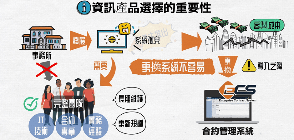 因此,企業一定要評估導入系統的廠商對於資訊系統的導入實績以外,更重要的後續他們公司的持續服務能力,如果他們公司的主體業務並不是以合約管理系統為主,是以事務所等服務為主,或許長期下來就是一個問題了。