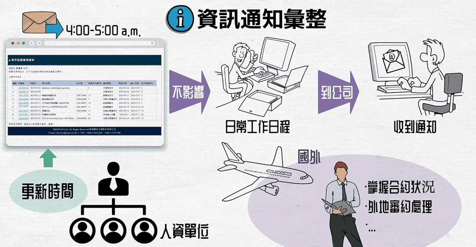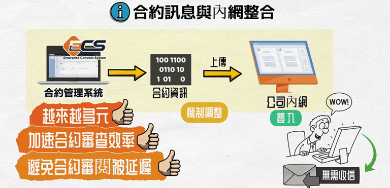 例如待辦合約等等資訊,直接上傳到公司的內網,讓同仁一登入帳密後,就可以清楚知道今日的待辦合約,連收信都不用了,這樣更能加速合約的審查效率,避免合約審閱被延遲。