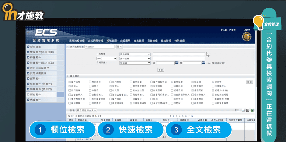 合約的檢索機制,分為三種:欄位檢索、快速檢索、全文檢索