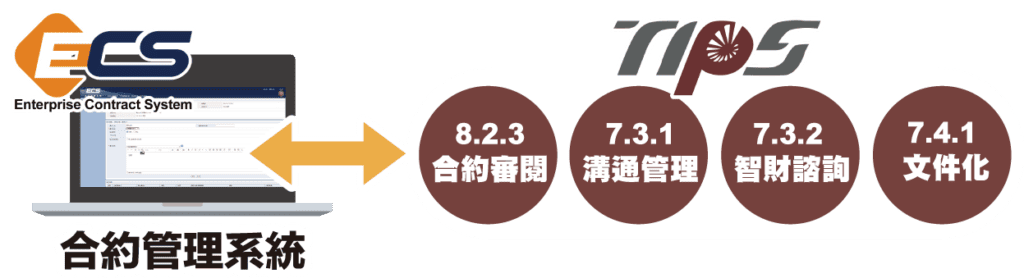 ECS是新穎公司的TIPS專家顧問不斷的在輔導過程之中,提出可以應用於系統中,強化內部合約管理效益的,並且滿足TIPS的規範。在TIPS7.3.1溝通管理顧問也建議我們ECS系統應該要新增有有「公告資訊服務」以及「FAQ園地」來即時反饋溝通資訊;TIPS7.3.2智財諮詢我們ECS系統也做了「諮詢園地功能」來服務相關的智財法律資訊;以及TIPS7.4.1文件化的最新表單、辦法等的下載連結,這些都是顧問在輔導經驗中,建議ECS系統針對合約的管理加值之處,跟法務有關的相關條款,都差不多了嘛!