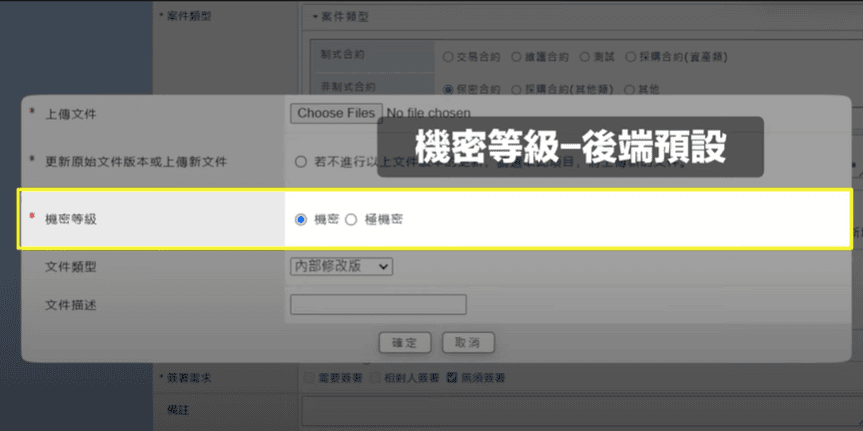 最近,我們在合約管理系統ECS上還有一個新的規劃,就是現行提案的合約,可以直接預設機密等級,當任何人在合約審查過程中,有下載文件時,我們不僅有儲存下載的logo紀錄以外,還會在合約的文件上標示「機密等級」等字樣,讓任何有機會接觸到這份尚未用印的合約文件使用者,都清楚知道這是機密文件,需要進行機密文件的使用管理機制,也就是在合約簽署的過程之中,就標示「機密字樣」了。合約在簽屬過程中就必須要進行機密管理了,這也是我們TIPS的要求規範喔!