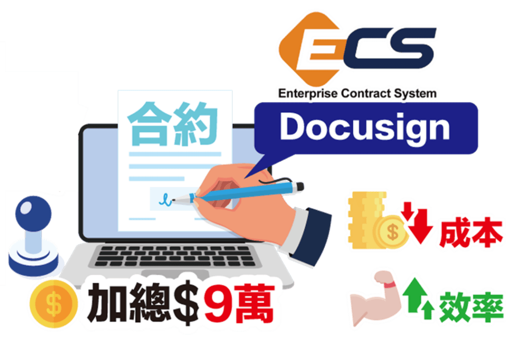 使用docusign的電子簽章,合約500份每年費用不過9萬元!我們ECS已經跟docusign的電子簽章整合了,所以這部分相關人工的作業處理,都可以免除了,重點是合約的簽署用印都可以隨時掌握,提升合約的管理品質。