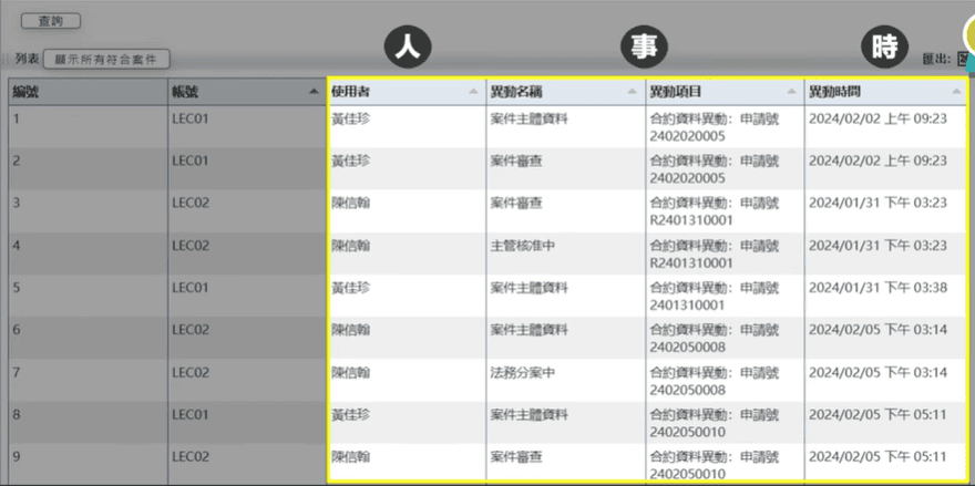 另外,我們ECS系統,所有的使用頁面都已經標示「機密」字樣,所以所有使用者進入,都應該邀遵循公司的機密管理制度運行。此外,合約要進行調閱,在ECS也可以進行相關的調閱申請,我們ECS也有針對合約進行調閱的服務功能,需求者可以針對合約進行調閱申請提案,同時後端也會有紀錄相關的使用等等,這部分都是符合機密管理的需求,也是符合TIPS的規範。