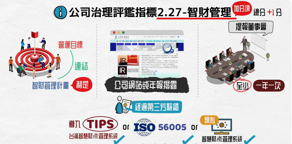 公司治理評鑑指標2.27項是在談「公司是否制訂與營運目標連結之智慧財產管理計畫,並於公司網站或年報揭露執行情形,且至少一年一次向董事會報告」,也就是要求上市上櫃公司要制定智慧財產權管理計畫。
