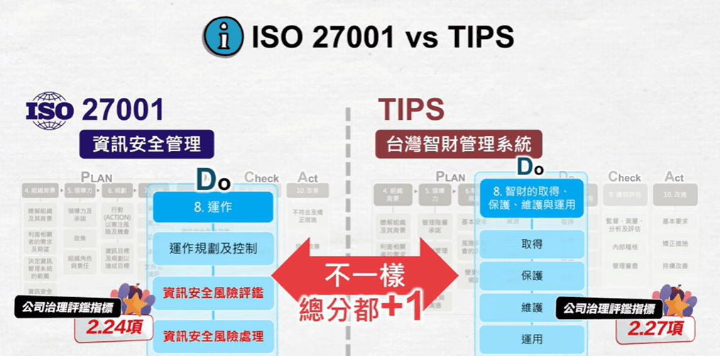 27001是資訊安全管理第8單元,是在談資訊安全「運作之規劃及控制」、「資訊安全風險評鑑」、以及「資訊安全風險處理」。但是TIPS第8單元是在談智財的「取得」、「保護」、「維護」、「運用」,這兩者完全不同。
