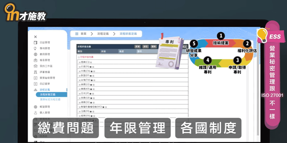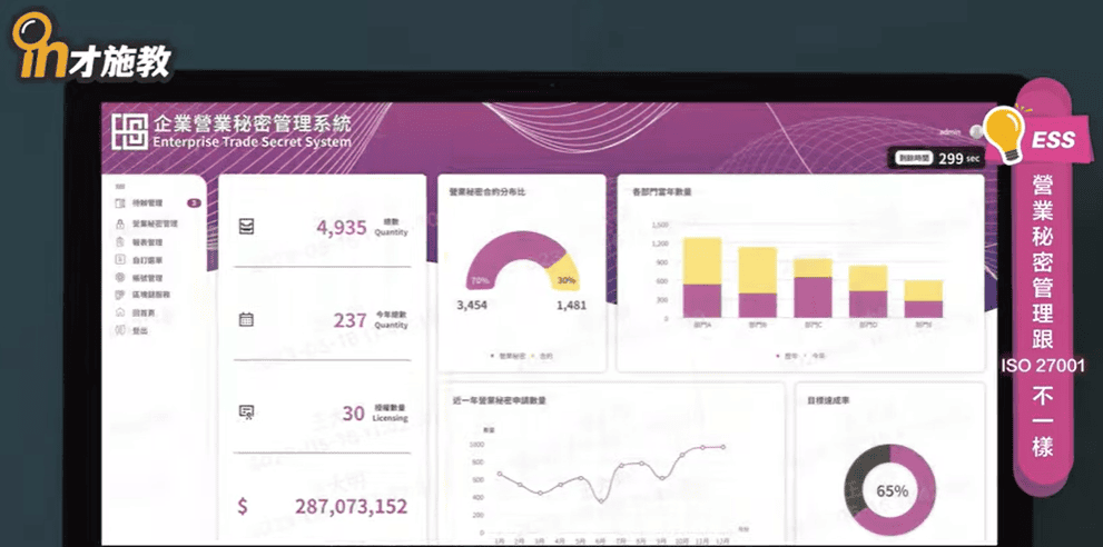 新穎公司為了因應市場的需求,今年也推出了營業秘密管理系統ESS,這是一個專門、專業的營業秘密管理系統,我們也是想藉由服務各大廠商的管理經驗,透過資訊系統的實作導入各企業,非常適合現在組織內如果還沒有營業秘密管理制度的廠商,可以用最快速、最省成本的方式,導入營業秘密管理制度,cp值是非常高的。