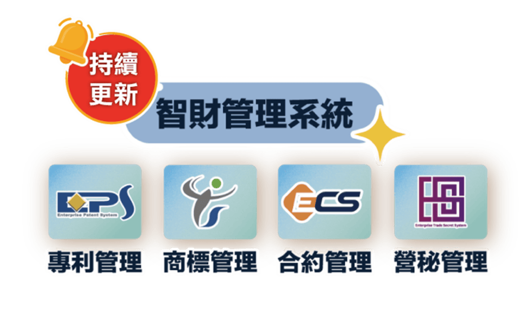 我們公司所有的智財管理系統,也會一直跟著委員給的意見,每年都新增調整功能,讓制度導入更順利,包含:專利管理系統eps、商標管理系統ets、營業秘密管理系統ess、合約管理系統ecs,隨時跟著法規和時事脈動跟進。