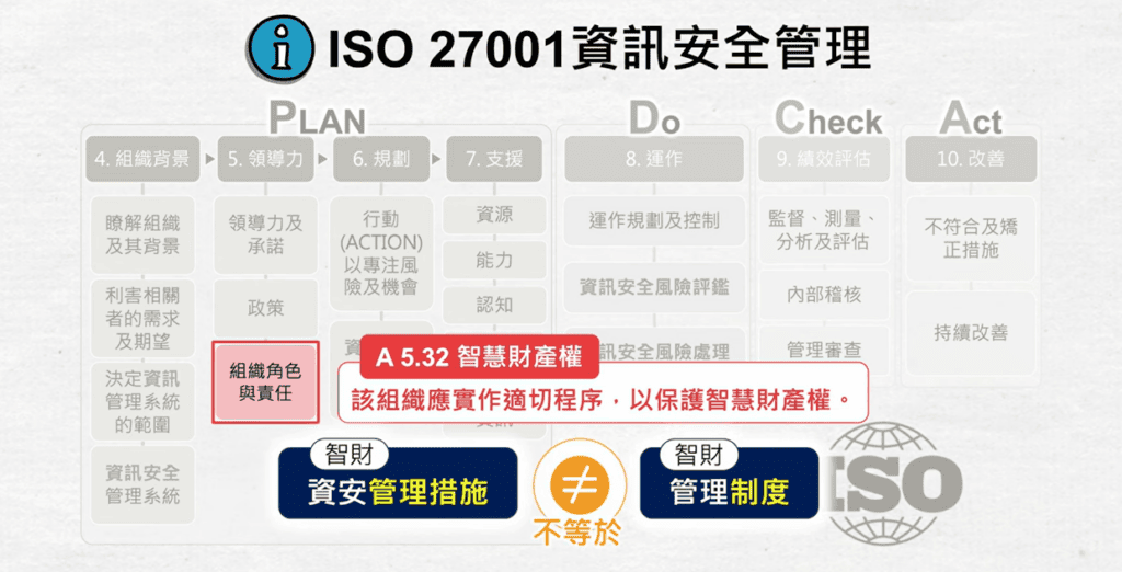其實在ISO 27001資訊安全的控制措施中,確實有一條A.5.32 智慧財產權,要求資訊安全要考慮「組織應實作適切程序,以保護智慧財產權」,但是這一條是在要求建立智慧財產權的資訊安全管制措施喔,跟智慧財管理理制度是完全不一樣的,這個大家可以回頭看我們在EP10─營業秘密管理跟ISO27001不一樣!