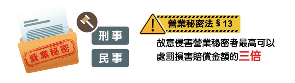 根據營業秘密法第13條規定,故意侵害營業秘密者,最高可處以損害額3倍哦!大家可不能不小心謹慎哦!