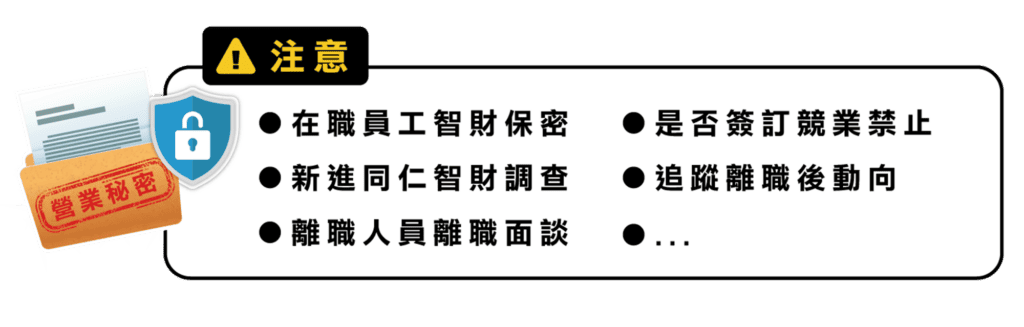 所以「營業秘密」,請大家一定要注意-保密問題;所涉及的管制對象,除了在職員工,也需要涵蓋新進同仁的「智財調查」,以及離職人員的離職面談,甚至考慮是否簽訂「競業禁止」,以及追蹤離職後的動向等等。