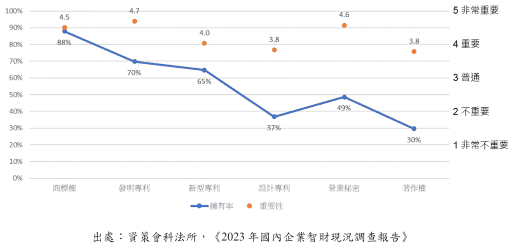從資策會科法研究所最近公布的「2023年國內企業智財現況調查報告」中,企業在智財權的重要度評分,滿分是5分,企業對於營業秘密的重要程度高達4.6分,僅次於「發明專利」的4.7分,顯見企業對於營業秘密的重視程度,在智財權的排名中是非常受企業廠商重視的。