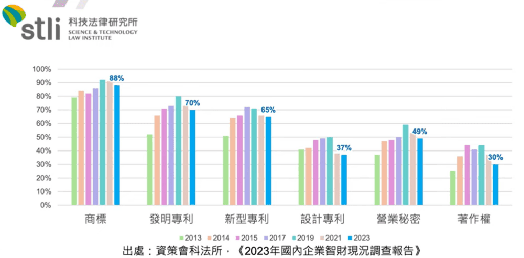 到底要做到甚麼樣程度才能在司法程序上,達到證據力的主張效果,可能也因為制度管理還沒有齊全,所以這個統計圖上看起來營業秘密雖然重視度高,但是營業秘密成果僅有49%。不過這也是需要企業內部的智財觀念養成,是需要時間的規劃與推動的。