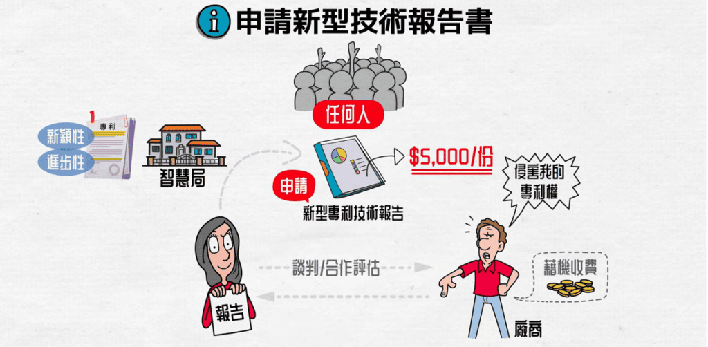 新型專利技術報告的申請,並不侷限於利害關係人,是任何人都可以提出申請的,所以下次如果有廠商不友善的來告訴您:「您侵害他的專利權」、或者宣告說「我這產品是有專利保護的,要跟你藉機多收費用」,但您一看是新型專利,您就可以向智慧局申請新型專利技術報告,每份報告費用基本費用是5000元。後續智慧局,就會指派審查委員,針對這件專利進行「新穎性與進步性」比對,最後提供新型專利技術報告,您就可以依據這份報告內容,作為你們之間談判或是合作的評估基礎。這都是必須要應用的,新型技術報告是不限申請人或權利人申請的。