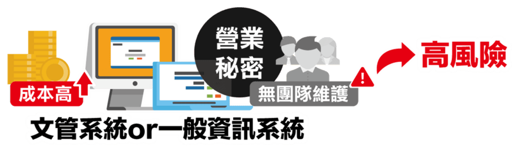 沒錯。有些公司會認為,不就是表單的填寫嘛,許多公司會利用公司現有的文管系統或一般的資訊系統來管理營業秘密,我們也建議這些系統產品的本質並非針對營業秘密管理機制設計,在權利的保護上需要客製更動,其實對組織的長期維護成本也會相當高,只能是短期的做法。而且因為沒有專門的團隊進行維護管理,後續也很容易讓企業的營業秘密管理系統變成孤兒,讓營密成果保護力涉入風險,也是高階管理者要思考的。重點是客製系統來管理營業秘密,這風險很高,不完善啦!企業不能因為因應短期的需求而委身將就透過內部系統的客製使用,應該要進行長期的安排規劃,讓系統的導入可以逐漸完整,並且提供服務的團隊要是專門、專業的。