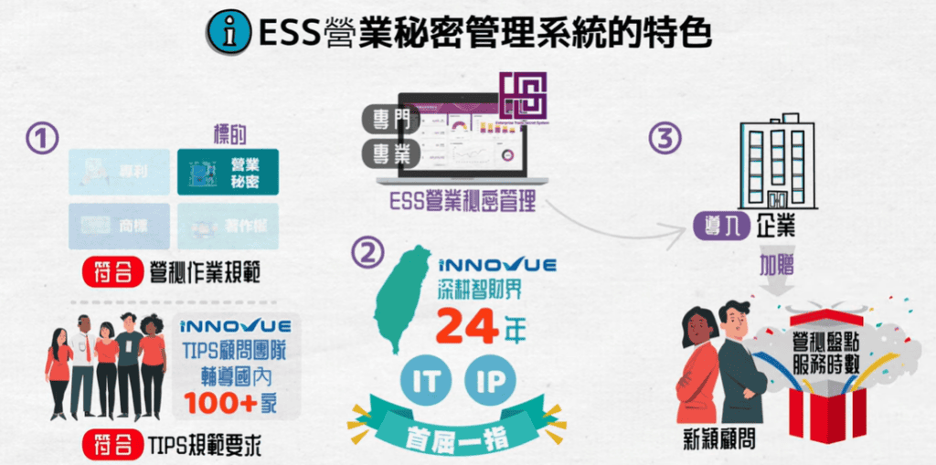 今天分享產業現行對於營業秘密保護相關作業的現況分享,在最後小薇也告訴我們,其實制度導入後要穩定的落實,甚至做到全公司的擴散,資訊系統的導入肯定是必須的。當然,新穎公司深根在國內智財界已經24年了,系統產品的成熟度肯定是國內第一。同時,該公司擁有TIPS顧問專家團隊,尤其在營業秘密標的的導入經驗更是豐富,所以ESS產品的規劃設計,就是該公司的顧問專家所提出的作業內容,肯定最符合TIPS驗證需求。最後,確實國內在導入營業秘密管理系統首要進行營業秘密的盤點,這部分新穎公司也提供顧問協助盤點的服務時數,讓系統的導入作業更加順暢,滿足客戶需求。