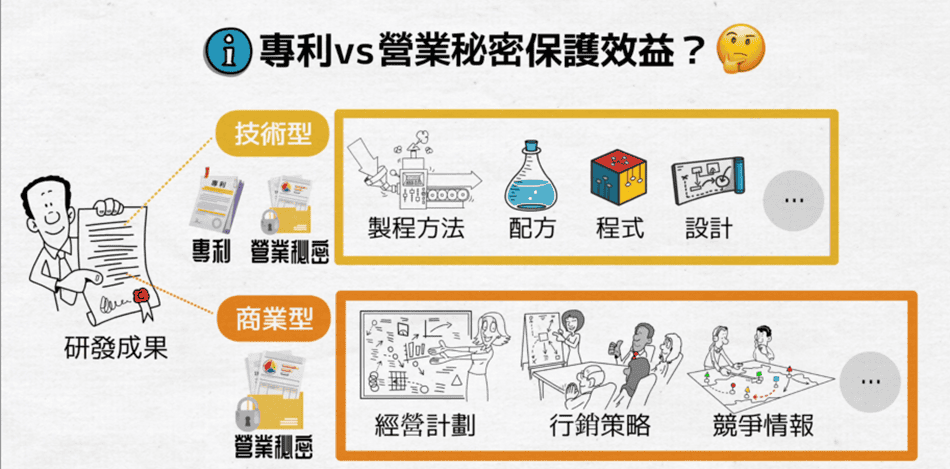 「商業型」的研發成果,像是經營計畫、行銷策略或經分析的競爭情報等,就只能透過「營業秘密」來保護。