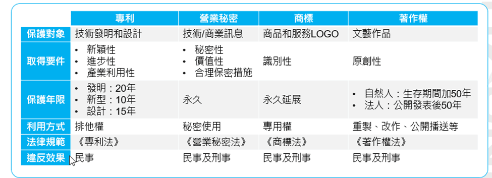 所以專利跟營業秘密可以保護「技術型」的創新成果,「營業秘密」保護標的還包括了「商情資訊」。