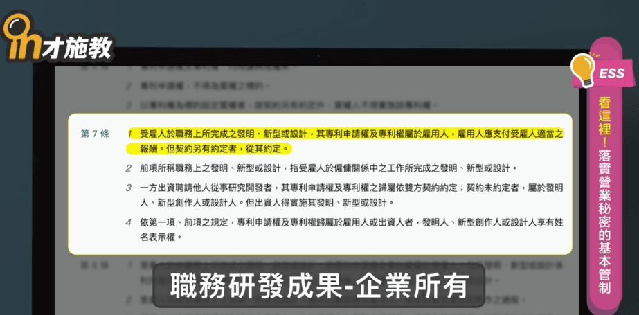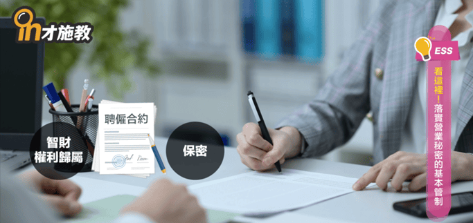 現在企業新人到職時,會透過簽訂「聘僱契約」,在契約書中,雙方約定「智財權利歸屬」及「保密要求」,要求同仁在職期間因職務產生之智財權利歸屬,以及要求必須遵守企業保密規範。