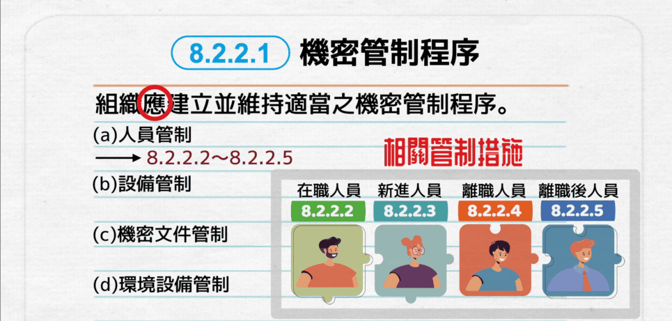 相關的措施包刮有:人員管制、設備管制、機密文件管制、以及環境設施管制,另外對於人員的管理在8.2.2.2、8.2.2.3、8.2.2.4、8.2.2.5各類的員工,包括在職人員、就職人員、離職人員、甚至離職後的人員都有相關的管理措施。