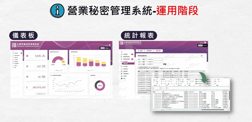 營業秘密管理在「運用階段」,這裡新穎公司就設計了兩個功能機制,「儀表板功能」以及「各式的統計報表功能」。