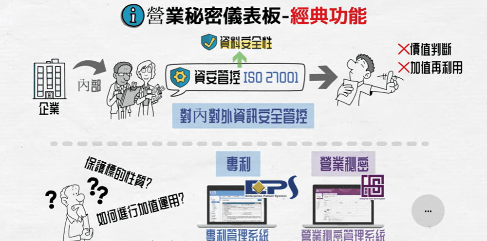 有些資訊人員可能會覺得奇怪,他們已經做了ISO27001的資安管控了,其中也有智慧財產管理,所以應該不需要再導入專利管理系統或是營業管理系統了。但這是因為資訊人員把資訊安全管控跟營業秘密管理混在一起了。