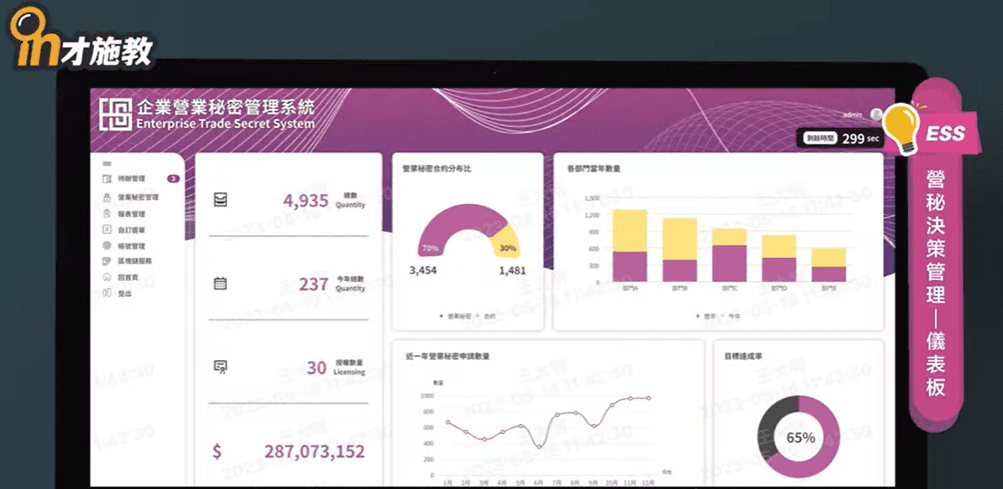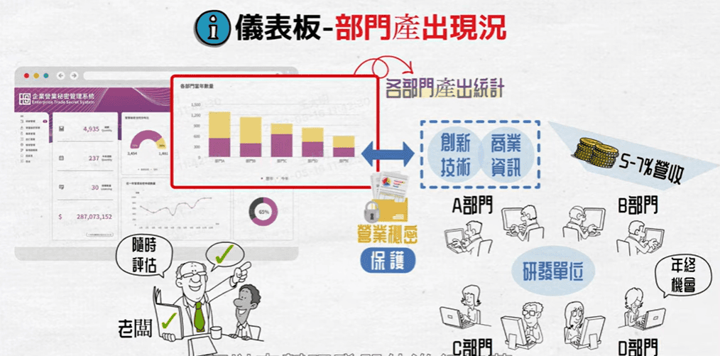 而且營業秘密管系統一定有一個管理的程序規範,也會產出在提案或是審查過程中的相關資訊產出,讓我們企業可以知道現行的營秘秘密保護成果,這就是儀表板功能。因為在提案或是管理的過程中,會有相關的資訊紀錄,就可以進行相關的統計分析,透過視覺性的圖表產出,讓有權限的管理者可以隨時掌握現行的概況。隨時掌握公司營秘現況,老闆更能知道研發經費投入的成果報酬,而且這資訊是隨時的統計。