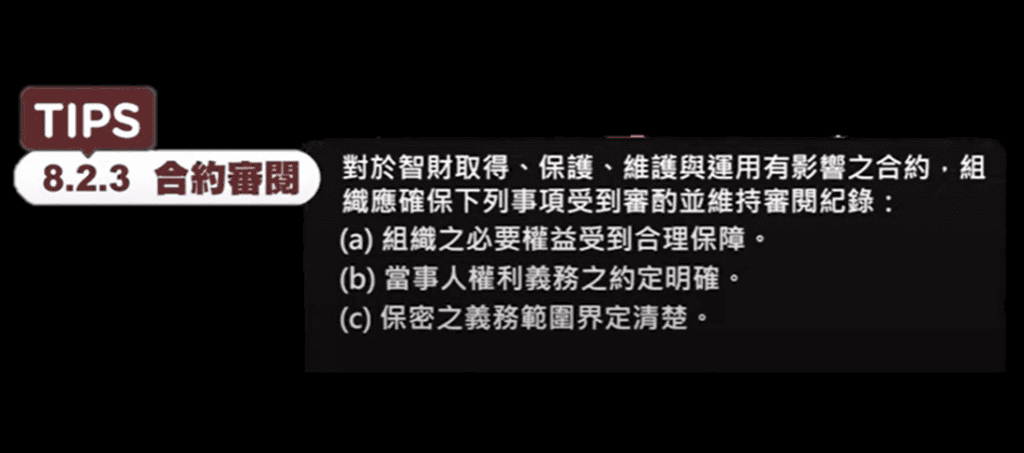 也就是「對於智財取得、保護、維護與運用有影響之合約,組織應確保下列事項受到審酌並維持審閱紀錄:
