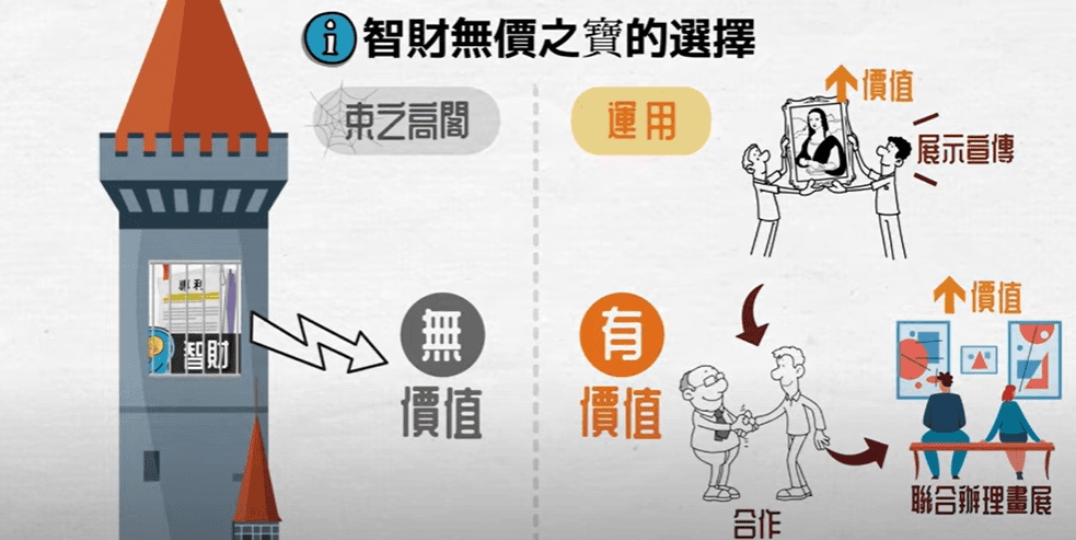 「閣樓上的林布蘭」將專利或是智財比作林布蘭畫作,如果您把它束諸高閣,不去利用它、展示它,那它的價值就會跟我家小孩的鬼畫符一樣,是無價的卻也沒有價值的。