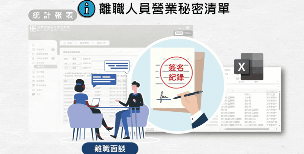 ESS系統上,在運用管理階段就有「報表統計」模組,其中就有「離職人員營密清單」,讓人員離職之際,要進行面談,確認在企業內任職期間,相關的營業祕密清單,雙方要清楚告知,並且有簽名紀錄,避免將來有爭議。