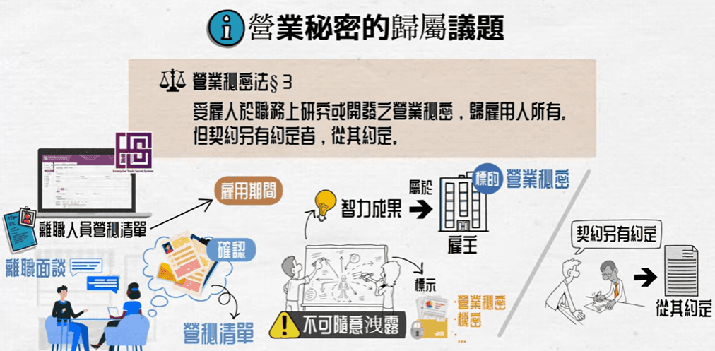 根據我們營業秘密法第3條規定「受雇人於職務上研究或開發之營業秘密,歸雇用人所有」,除非雙方有契約約定者,從其約定。