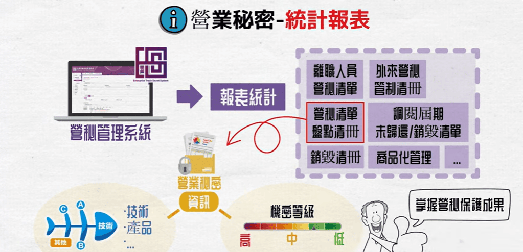 同時,如果您在一開始提案人註冊的時候,就有設計技術、產品等等分類,或是極機密等級,我們這裡的盤點清冊也會逐一的統計分析,讓老闆更能夠掌握在組織內的營業秘密保護成果。