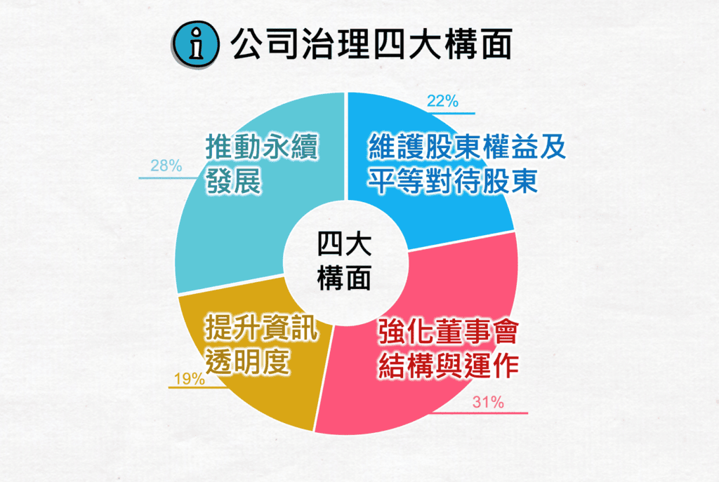 公司治理是近年來組織非常重要的議題,公司治理有四大構面,其中就包括有:維護股東權利及平等對待股東、強化董事會結構與運作、提升資訊透明度、推動永續發展四大構面。