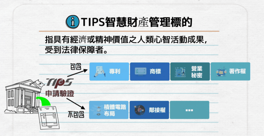 TIPS導入的智財管理標的,涵蓋的智慧財產管理標的,是指具經濟或精神價值之人類心智活動成果,受到法律保護,包含有:「專利」、「商標」、「營業秘密」、「著作權」四種智慧財產權。其中並不包含「積體電路布局」、「植物品種或種苗」以及「鄰接權」。