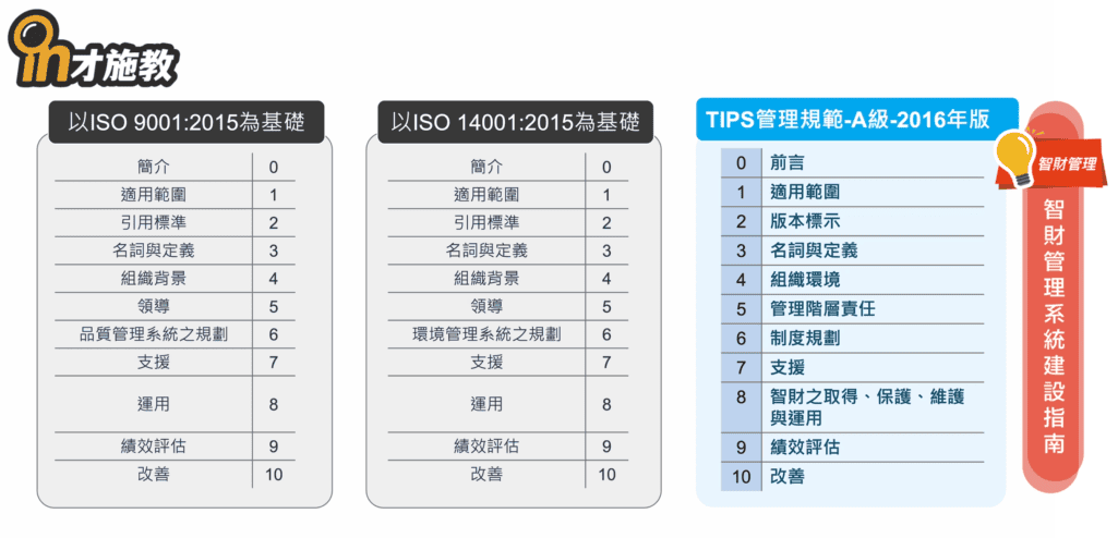 其實主要就是第8單元的部分嘛!第8單元就是各個管理系統的營運,會因為您的制度標的,產出不同的產出,像是9001就是以「品質管理」為主、27001就是「資訊安全」為主、我們TIPS就是「智財管理制度」為主哦。