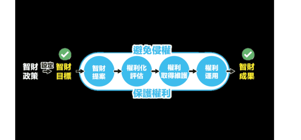 也就是從保護公司的權利標的為出發,進而規劃導入的制度,確實這樣也更能強化公司在落實的規範與想法。擬定好智財目標後,從「智財提案」、「權利化評估」、「權利取得維護」、「權利的運用」,進而產出可以「保護權利」、「避免侵權」的智財成果,這樣這個智財成果一定會與企業的智財目標連結,具有一致性,就能真正做到強化組織在市場的競爭力。
